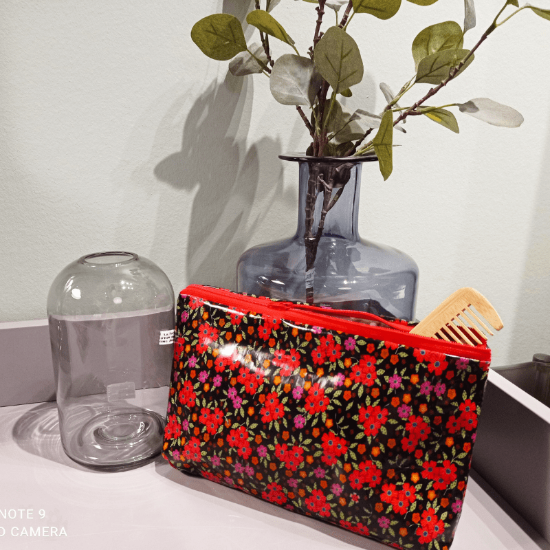 Une jolie trousse de toilette en coton enduit noire avec des fleurs rouges, oranges et roses à l'extérieur et un coton enduit beige avec des pois blancs à l'intérieur.