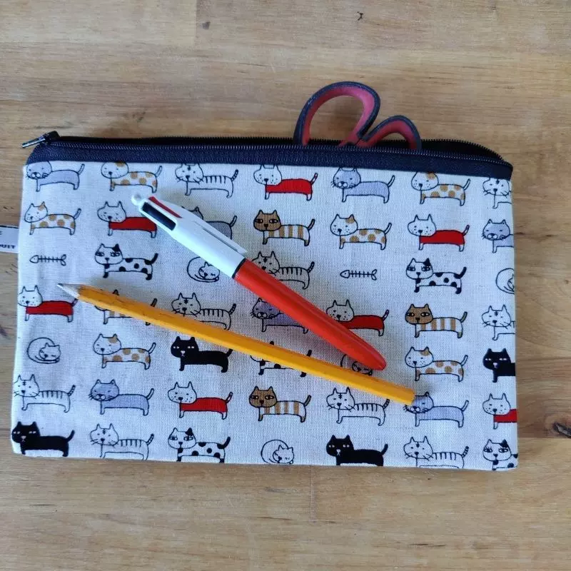 Très jolie Trousse en coton beige avec des chats rigolos, coton enduit beige à pois blancs donc imperméable à l’intérieur, parfaite pour l’école ou pour glisser dans son sac à main